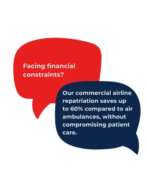 Air medical repatriation via commercial airlines provides up to 60% lower cost compared to private air ambulances, without compromising on safety or care